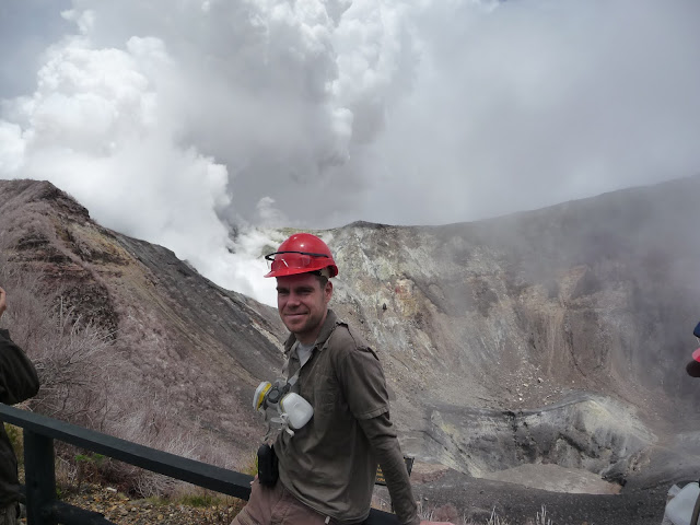Aprovechando todo ello decidimos acercarnos para visitarlo, y después de unos 45 minutos nos plantamos en La Central (después de llegar al pueblo de La Pastora y desviarnos), que es donde se encuentra la entrada al Parque Nacional del Volcán Turrialba. El precio de la entrada es de 7.000 colones (14 USD) para locales o residentes (nosotros pasamos por residentes) o 30 USD para extranjeros. Además se pagan 1.500 colones por el parqueo. El precio incluye la entrada al volcán, el uso del material preventivo (casco y máscara purificadora por si acaso el humo que sale del cráter cambia de dirección y va directamente hacia donde está el mirador), el transporte hasta el cráter y el guía que va explicando la visita. Además solamente está permitido que en el volcán hayan 12 personas a la vez. En el cráter resulta espectacular observar la columna de humo que sale de él (no del cráter principal, sino de uno que tiene a su izquierda), además de escuchar el ruido que hace el agua hirviendo que hay debajo. Hemos tenido suerte y el tiempo está algo despejado, así que podemos verlo un buen rato. Aún así no está lo suficientemente despejado para ver el horizonte completo. Es una lástima porque en teoria desde la cima se ve el Caribe y otros volcanes como el Poás y el Irazú.